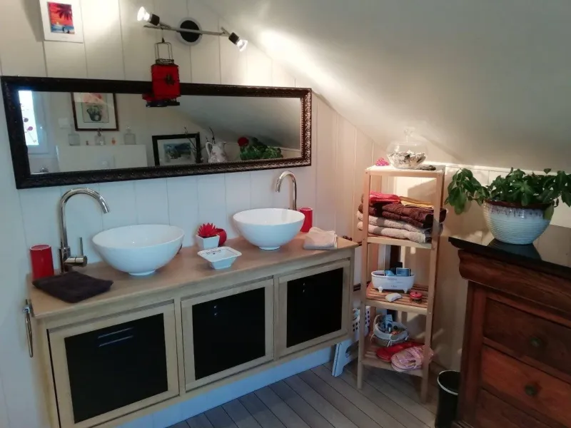 One bathroom for the 2. As soon as one flat is booked, the other will be closed to bookings, except for families and/or couples of friends.
