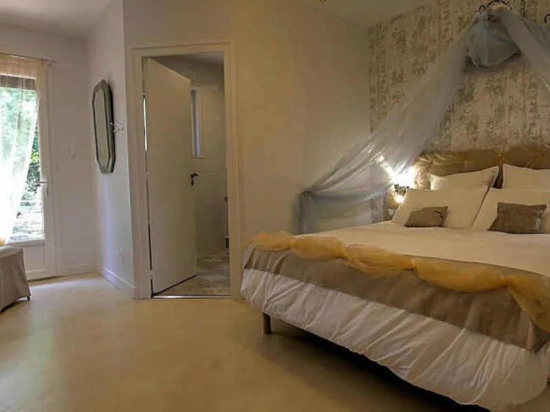 * chambre cuivre : 1 lit en 140x190 + 1 lit d’appoint enfant ; exposition est, vue sur piscine et jardin potager